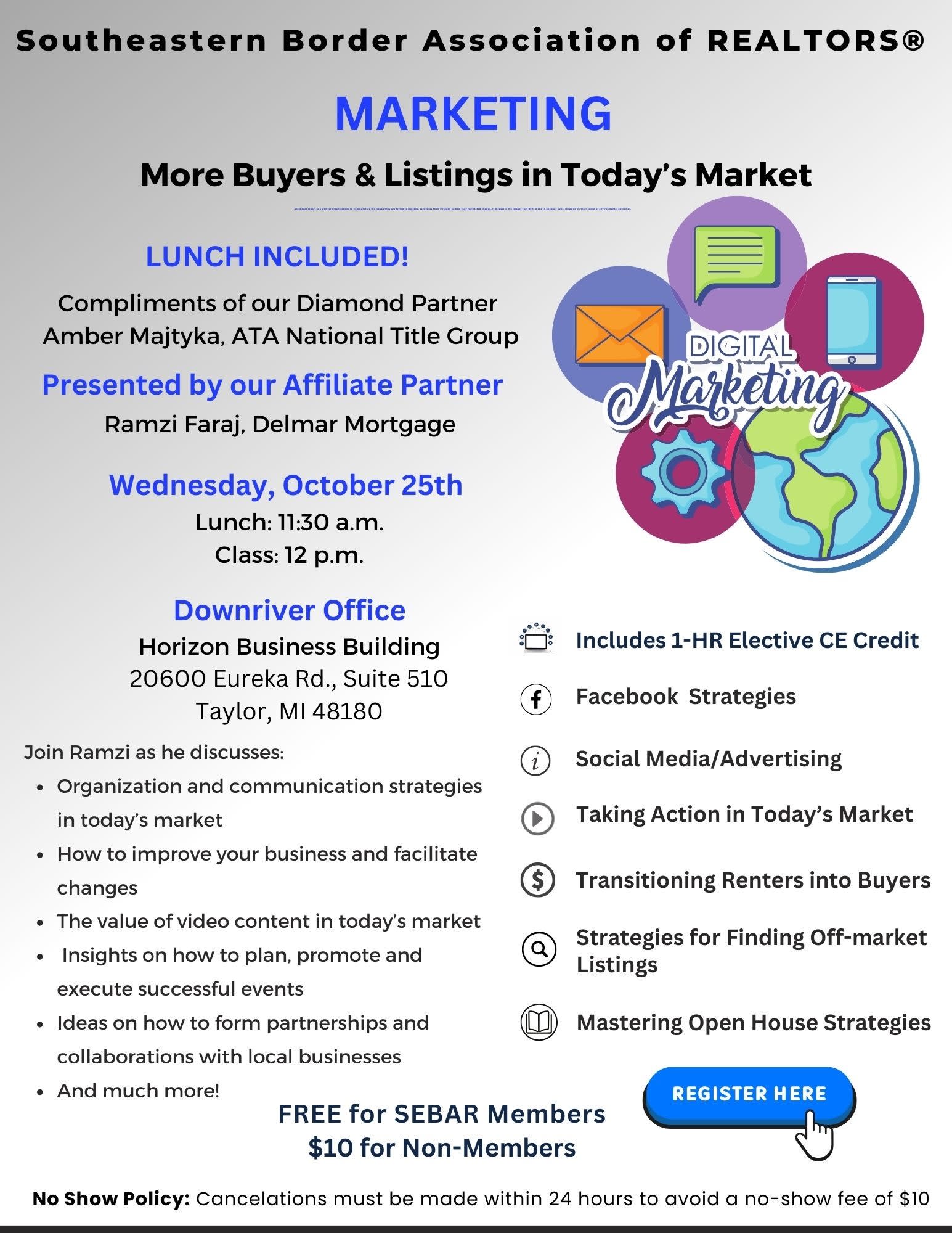 Join Ramzi Faraj, Delmar Mortgage as he discusses ways to organizations and communicate strategies in today’s market. Improve your business, as well as how they facilitated changes. Emphasize the value of video content in today’s market. Provide insights on how to plan, promote and execute successful events. Share ideas on how organization can form partnerships and collaborations with local businesses and much more! Lunch is included: Complements of our Diamond Partner Amber Majtyka, ATA National Title Group