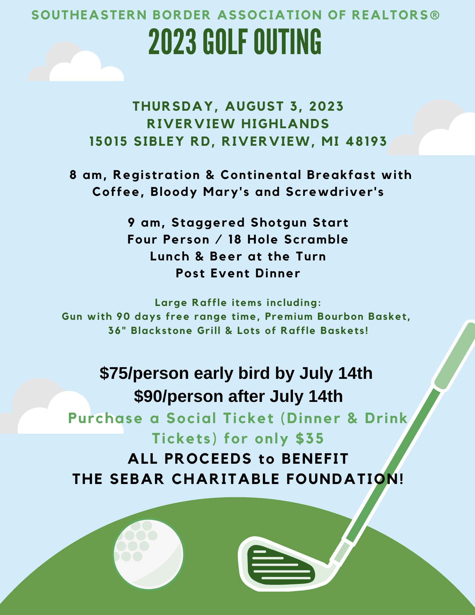 9 a.m., Staggered Shotgun Start, Four Person / 18 Hole Scramble. Includes Lunch & Beer at the Turn. Post Event Dinner.