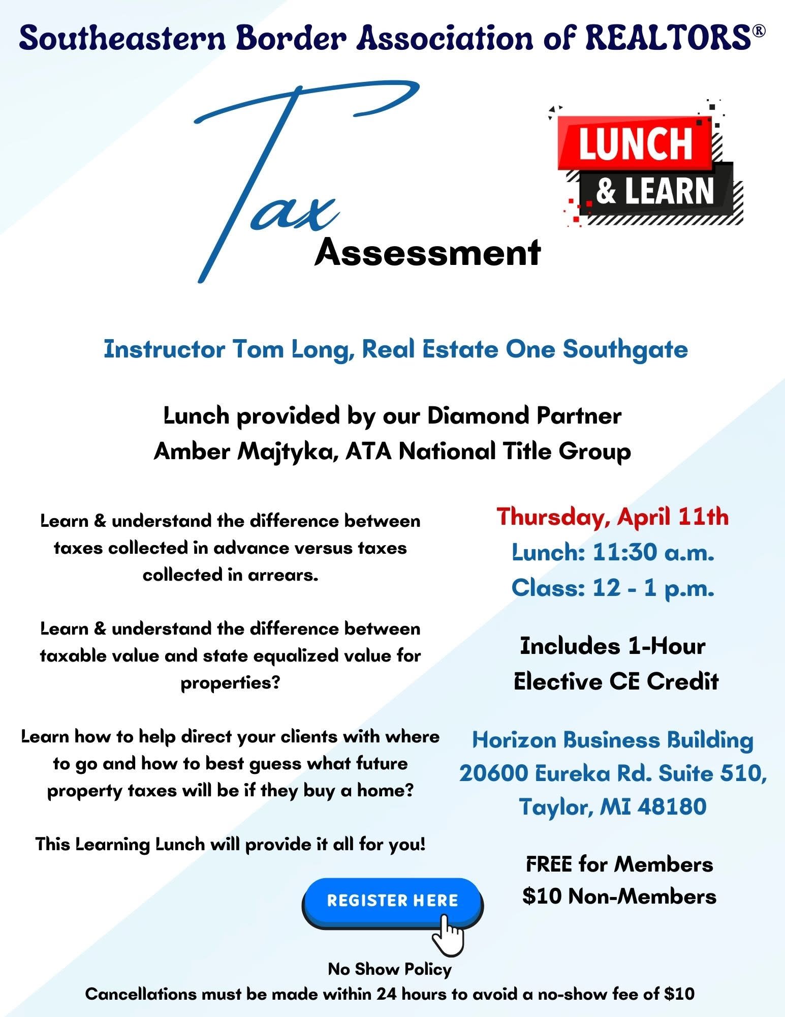 Instructor Tom Long, Real Estate One Southgate Lunch provided by our Diamond Partner Amber Majtyka, ATA National Title Group Learn & understand the difference between taxes collected in advance versus taxes collected in arrears. Learn & understand the difference between taxable value and state equalized value for properties? Learn how to help direct your clients with where to go and how to best guess what future property taxes will be if they buy a home? This Learning Lunch will provide it all for you!