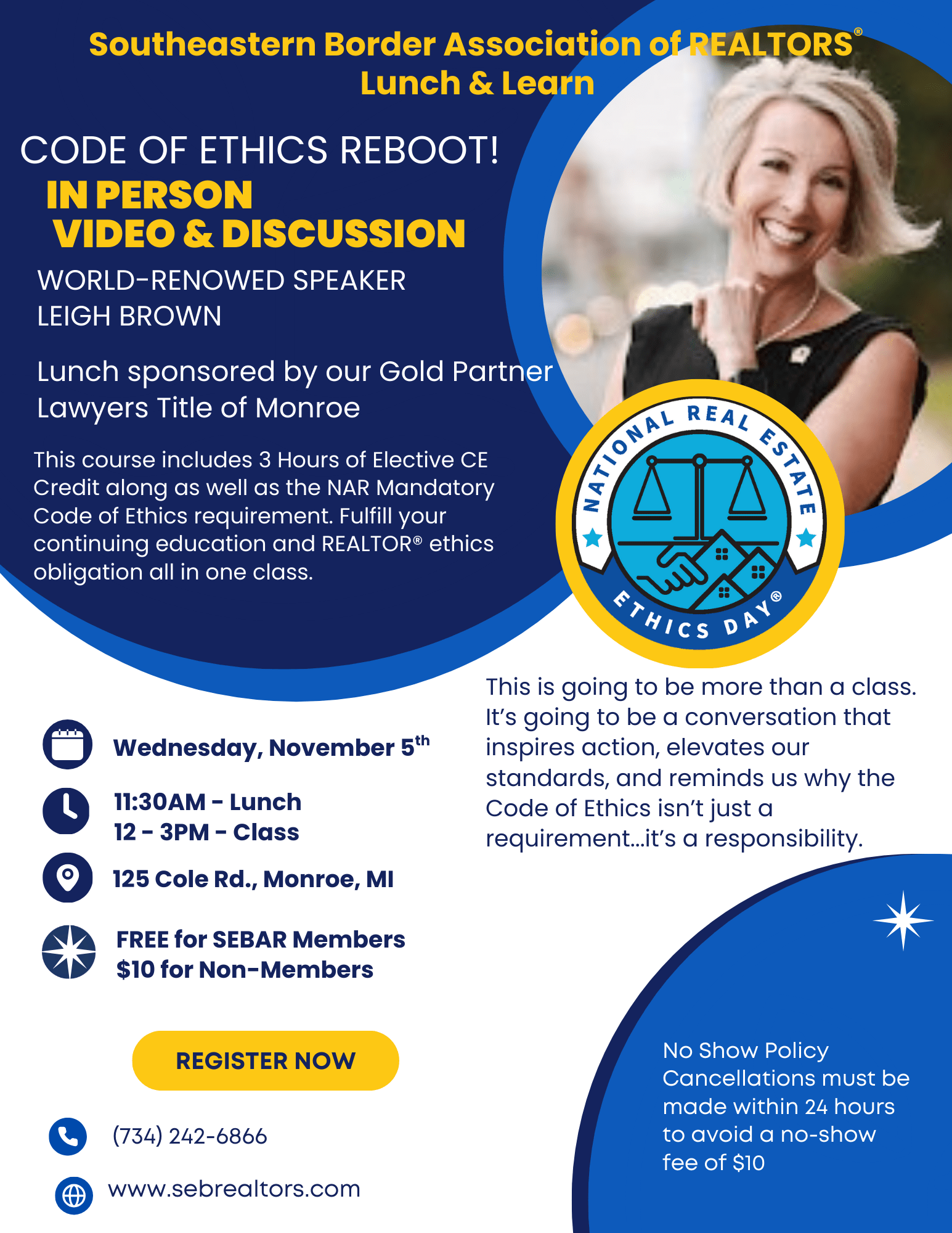 Lunch and Learn - CODE OF ETHICS REBOOT! In Person Video & Discussion! Class Includes 3-HRs Elective CE Credit & NAR Mandatory COE - (Monroe Office)